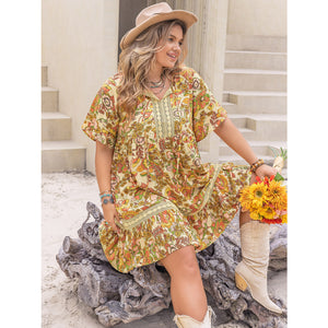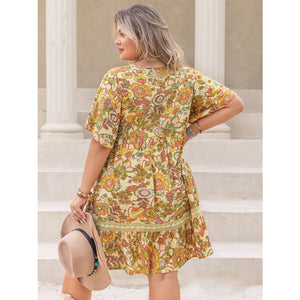 Plus Size Printed Tie Neck Short Sleeve Mini Dress