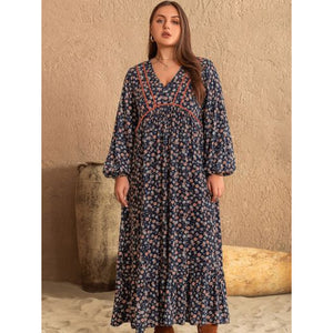 Plus Size Printed V-Neck Balloon Sleeve Dress