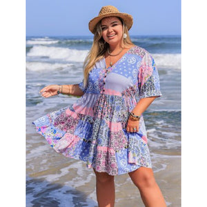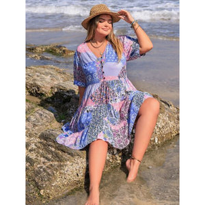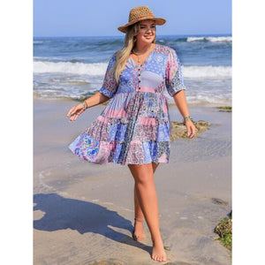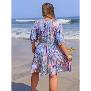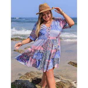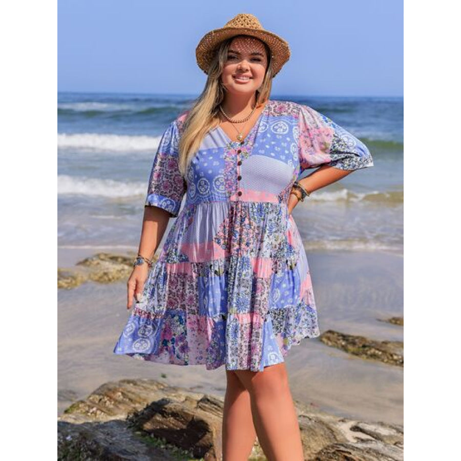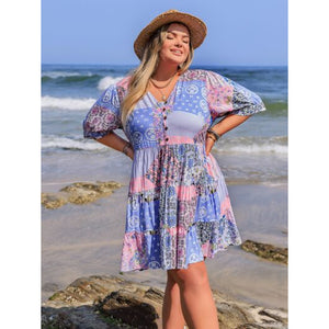 Plus Size Printed V-Neck Tiered Mini Dress