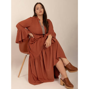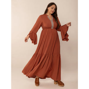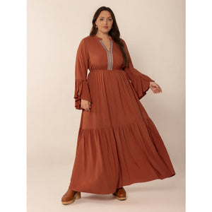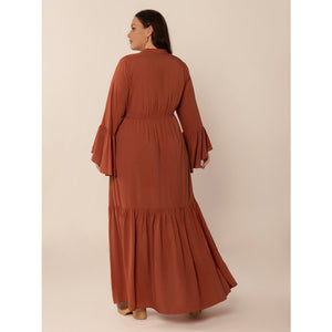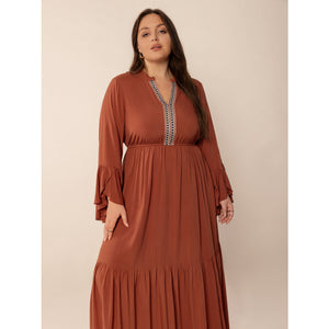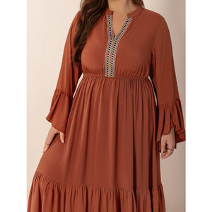 Plus Size Ruffled Notched Long Sleeve Midi Dress