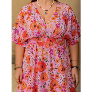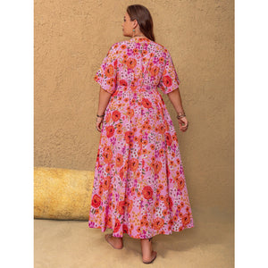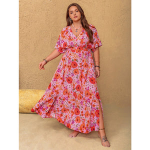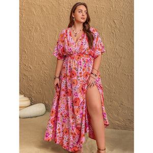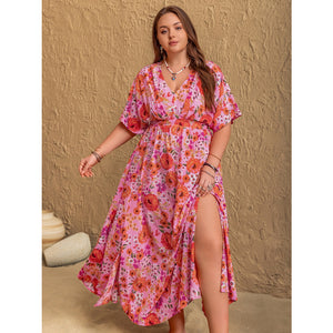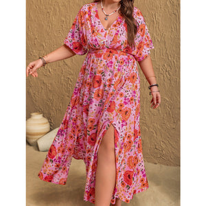 Plus Size Slit Floral V-Neck Half Sleeve Maxi Dress