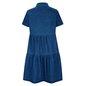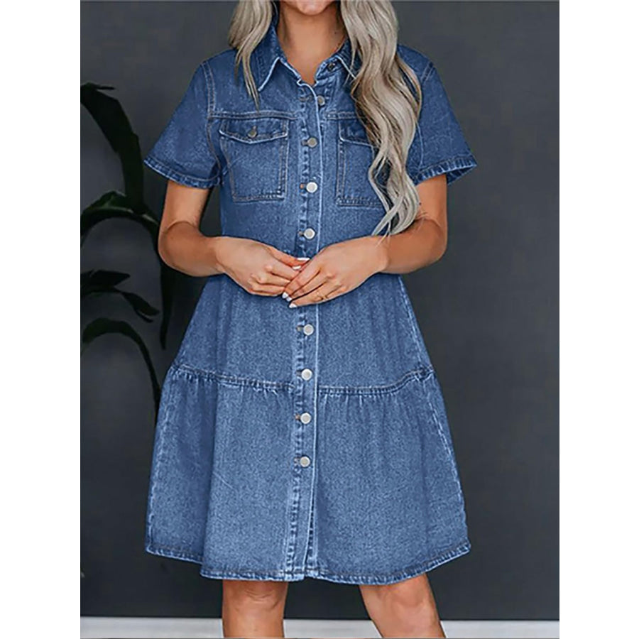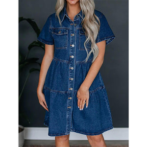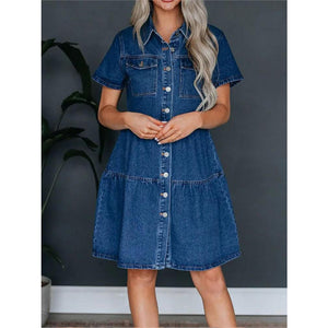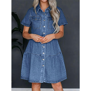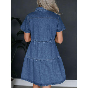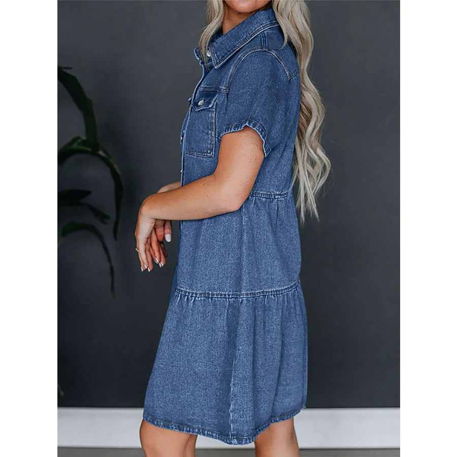 Pocketed Button Up Collared Neck Short Sleeve Denim Dress