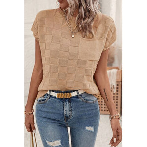 Pocketed Checkered Round Neck Knit Top