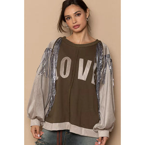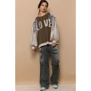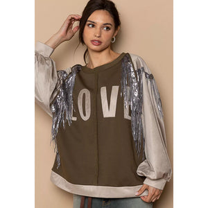 This stylish oversized sweatshirt features a premium cotton blend construction for ultimate comfort and durability. The eye-catching olive green base showcases a bold LOVE graphic print while contrasting beige balloon sleeves add visual interest. Stunning sequin fringe detailing along the sleeves creates movement and glamour, making this piece perfect for casual outings or statement streetwear looks. The relaxed oversized fit provides comfort while maintaining a fashion silhouette. Ideal for layering and perfect for those who want to make a fashion statement with comfortable everyday wear.