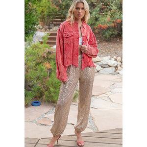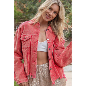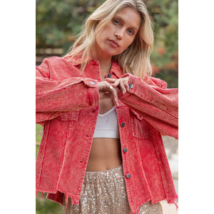 This striking red corduroy jacket combines vintage charm with contemporary style. Crafted from premium corduroy fabric, it features a classic oversized silhouette that's perfect for layering. The rich red color adds a bold statement to any wardrobe, while the traditional button-front design and chest pockets provide both style and functionality. The relaxed fit makes it ideal for casual wear or as a statement piece over dresses and tops. This versatile jacket transitions seamlessly from day to night, offering both comfort and fashion-forward appeal with its textured corduroy material and timeless design elements.