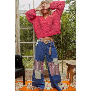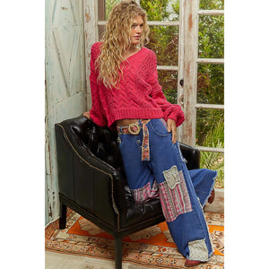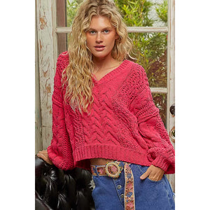 POL Cable-Knit Solid V-Neck Cropped Sweater