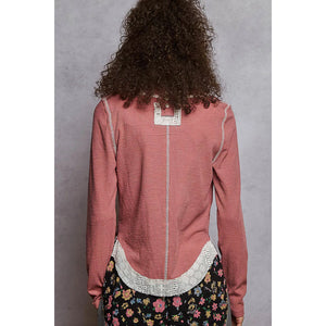 The Designed round neck long sleeve top features a regular fit and ribbed texture with eyelet patch details. The raw edges and outseam add a touch of edgy flair to the design. The vintage washing technique gives the top a unique and worn-in look. This top comes in a solid color, making it easy to mix and match with other pieces in your wardrobe. Elevate your everyday style with this fashion-forward and versatile top.