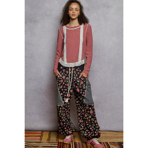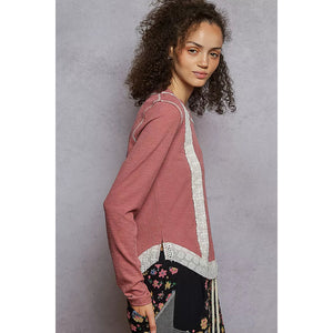 POL Contrast Round Neck Long Sleeve Ribbed Top with Eyelet Patch