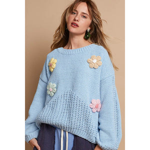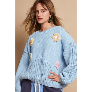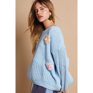 POL Crochet Flower Round Neck Dropped Shoulder Sweater