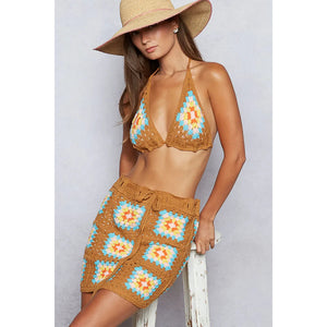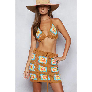 This stunning bohemian crochet sweater set features a meticulously handcrafted granny square pattern in vibrant orange, turquoise, and white colorway. The two-piece ensemble includes a triangle bralette top with adjustable halter ties and a form-fitting mini skirt, both showcasing the same intricate crochet work. Made from soft cotton blend yarn, this set offers comfortable stretch and breathability perfect for summer festivals, beach vacations, or casual boho-chic styling. The geometric floral motifs create a striking visual impact while the retro-inspired design appeals to fashion-forward women seeking unique, artisanal pieces that stand out from mass-produced clothing.