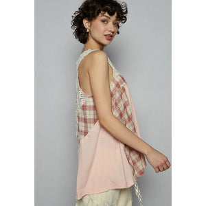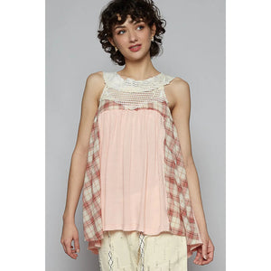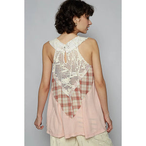POL Crochet Lace Plaid Panel Detail Tank
