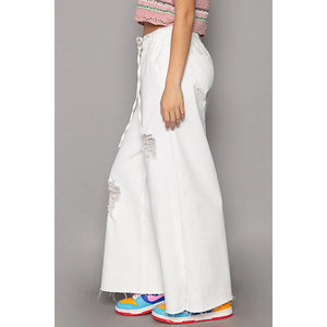 These fashion wide leg pants feature a comfortable high-waisted design with an adjustable drawstring closure for the perfect fit. Made from soft cotton blend fabric, they showcase fashionable distressed details with strategic rips and frayed edges for an edgy streetwear aesthetic. The relaxed silhouette offers all-day comfort while side slits add contemporary flair. Perfect for casual outings, these versatile pants pair effortlessly with crop tops and sneakers for a laid-back chic look.
