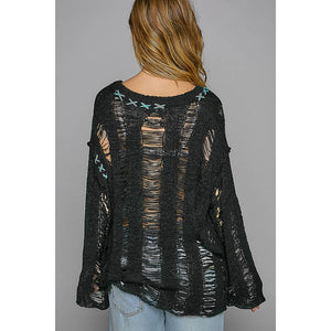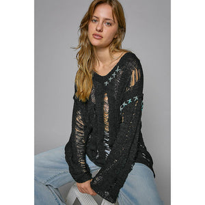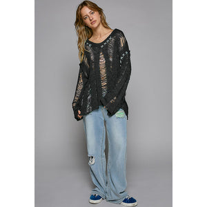 POL Distressed Dropped Shoulder Long Sleeve Knit Top