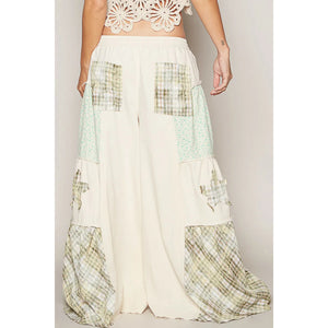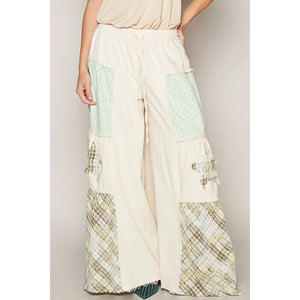 These bohemian patchwork wide leg cargo pants feature a unique artistic design with mixed fabric panels in cream, mint green, and plaid patterns. Made from comfortable cotton blend materials with an elastic waistband for easy wear. The wide leg silhouette offers maximum comfort and movement while multiple cargo pockets provide practical storage. Perfect for casual outings, festival wear, or bohemian-inspired styling. The relaxed fit and soft fabrics make these pants ideal for all-day comfort with a distinctive handcrafted aesthetic.