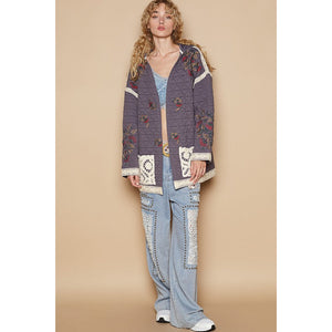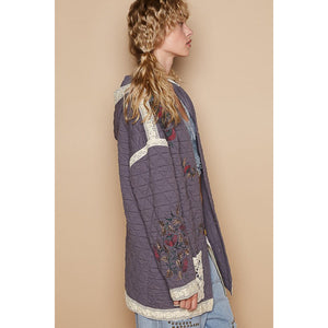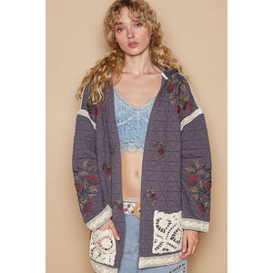 POL Embroidered Open Front Quilted Jacket with Crochet Pockets