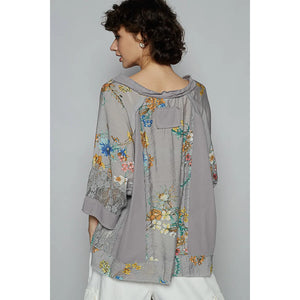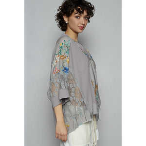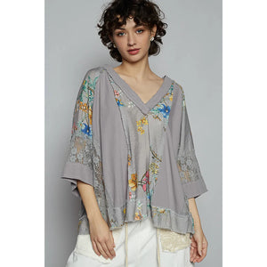POL Floral V-Neck Raw Edge T-Shirt with Lace Detail