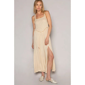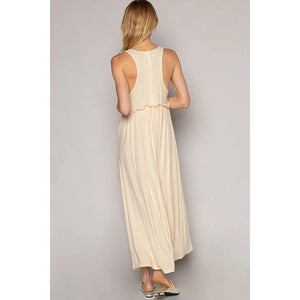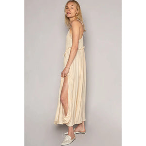 This stunning bohemian-inspired maxi dress features a sleeveless design with delicate adjustable straps and a flattering side slit that adds movement and elegance. Crafted from lightweight, breathable fabric in a versatile neutral beige tone, this dress offers ultimate comfort and style. The relaxed fit and flowing silhouette make it perfect for casual outings, beach vacations, or summer events. The dress combines effortless sophistication with bohemian charm, featuring a comfortable elastic waistband and ankle-length hem. Its versatile design allows for easy styling with sandals for a casual look or heels for more formal occasions.