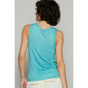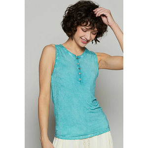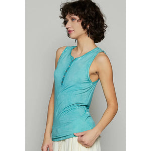 This tank top features a stylish half-button design and a classic round neck. The washed finish gives it a relaxed and laid-back look. Perfect for casual outings or layering under other pieces, this tank is a versatile addition to your wardrobe. Stay comfortable and on-trend with this stylish top.