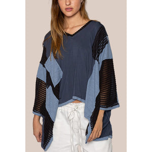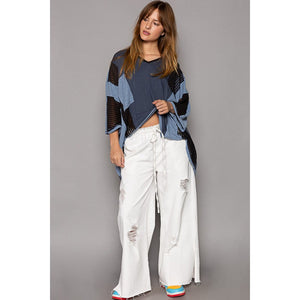 The designed V-neckline knit top features an oversized fit and drop shoulder design, creating a relaxed and stylish silhouette. Made with a unique blend of see-through fabrics, this top offers a modern and edgy look that is perfect for making a statement. The frayed edge detailing throughout the garment adds a touch of texture and a hint of urban chic. Whether styled with jeans for a casual outing or tucked into a skirt for a more elevated look, this knit top is versatile and fashion-forward. Embrace the contemporary and trendsetting style of the V-neckline knit top for a bold and confident ensemble that showcases your individuality.