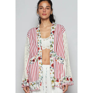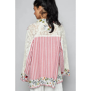 POL Lace Long Sleeve Striped Cardigan with Floral Patchwork Detail
