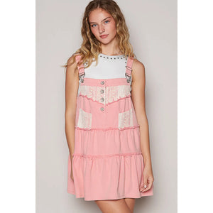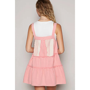 This charming pink denim overall dress features a unique combination of soft pink denim fabric with delicate lace patchwork accents. The dress showcases a vintage-inspired overall design with adjustable shoulder straps and decorative metal button closures. The multi-tiered construction creates a flattering A-line silhouette with romantic ruffle details. Made from comfortable denim material, this versatile piece offers a relaxed fit that's perfect for casual outings. The contrasting lace panels add feminine texture and visual interest, while the adjustable straps ensure a customizable fit. This dress embodies effortless style with its playful yet sophisticated design.