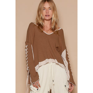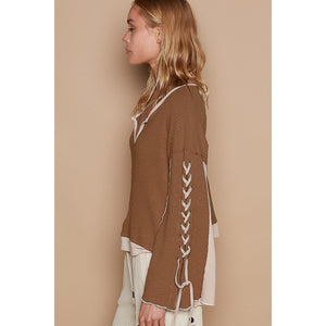 POL Lace-Up Sleeve Color Block Ribbed Knit Top