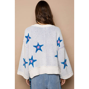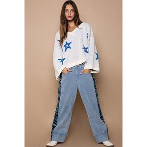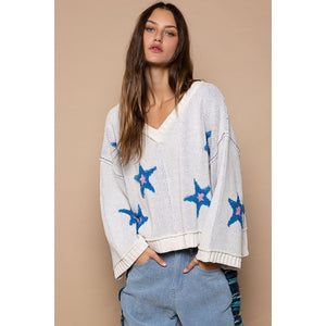 The V-neck Long Sleeve Sweater is a stylish top designed with unique details to make a statement. Featuring a regular fit and long sleeves, this sweater offers a comfortable and flattering silhouette. The standout elements include an out seam detail, color-blocked star berber patch, rib band point, and reverse out seam point, adding an edgy and modern twist to the classic sweater design. Made with high-quality materials, this top is both stylish and cozy, perfect for everyday wear. Elevate your look with this eye-catching sweater that combines trendsetting style with comfort for a fashionable ensemble. Stay on-trend and comfortable with the V-neck Long Sleeve Sweater that is sure to make you stand out in style.