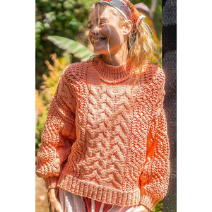 The mock neck cable knit sweater features a stylish design with a mock neck, long sleeves, and a roomy fit. It is made from chenille fabric and showcases twisted cable knitting detail for a unique and cozy look.