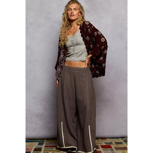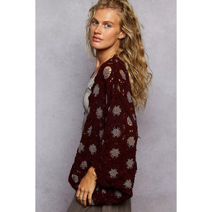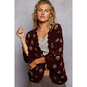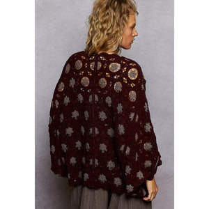 POL Openwork V-Neck Chenille Cardigan with Contrast Floral