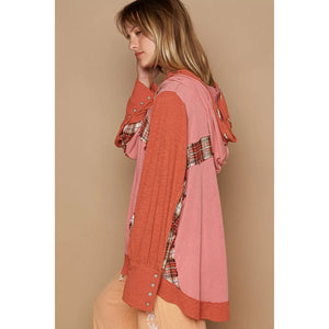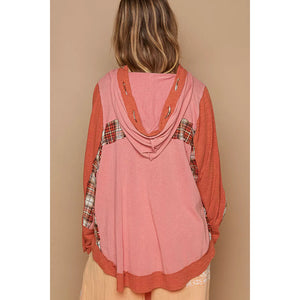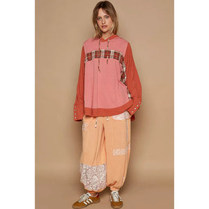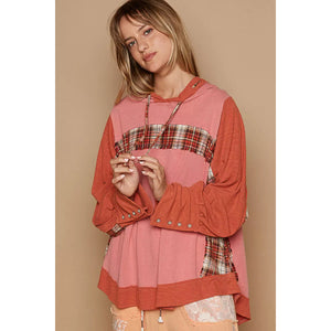 POL Oversized Drawstring Long Sleeve Hoodie with Plaid Detail