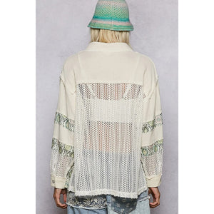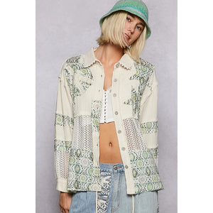 POL Printed Crochet Patchwork Button-Up Shirt