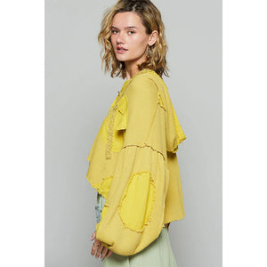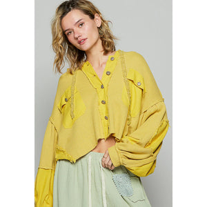 This oversized distressed yellow knit jacket features a relaxed fit with dropped shoulders and cropped length. Made from soft ribbed knit fabric with intentional distressing details for a vintage worn-in look. The bright yellow color adds a bold pop to any outfit. Features button-up front closure and long sleeves with fitted cuffs. Perfect for casual layering and streetwear styling. The oversized silhouette provides comfortable movement while maintaining a fashion fashion-forward appearance.