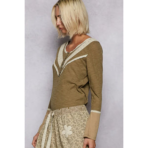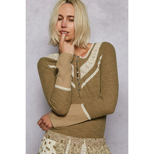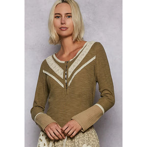 Stay stylish with this Ribbed Half Button Lace Detail Knit Top. The ribbed knit fabric provides a flattering fit while the half button design adds a touch of sophistication. The delicate lace detailing enhances the feminine look of this top, making it perfect for both casual and dressy occasions. Update your wardrobe with this chic and versatile piece today!
