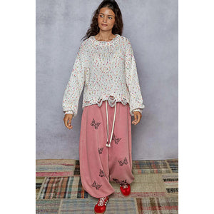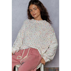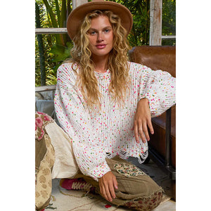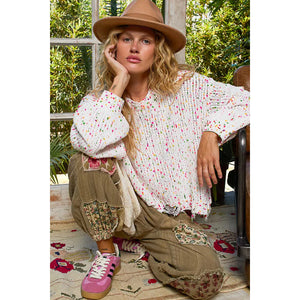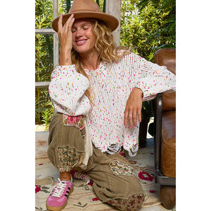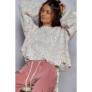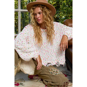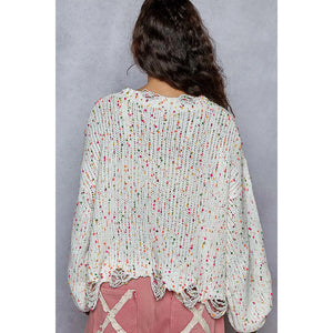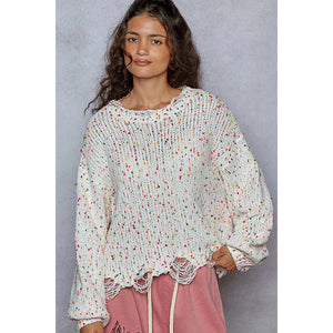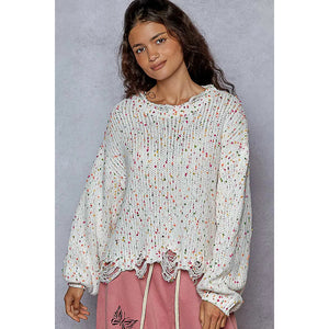 This round neck sweater is designed with long sleeves and a regular fit for a comfortable and stylish look. The popcorn texture features hints of various colors throughout, adding a fun and unique touch. The distressed and fringed hem detailing adds a trendy and edgy vibe to this sweater. Stay cozy and on-trend with this eye-catching sweater featuring a mix of colors and stylish distressing.