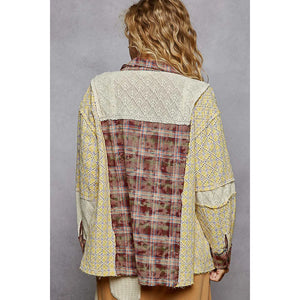 This stylish patchwork shirt features a unique combination of plaid and geometric patterns in warm earth tones. Made from a comfortable cotton blend fabric with mixed textures, this versatile piece offers a relaxed fit perfect for casual layering. The shirt showcases distinctive color blocking with burgundy plaid sections, cream geometric prints, and yellow accents. Its button-up design and long sleeves make it ideal for transitional weather, while the oversized silhouette ensures comfortable all-day wear. Perfect for creating effortless street style looks or adding a vintage-inspired touch to any outfit.