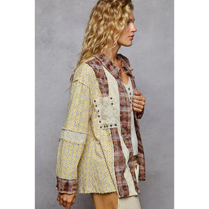 POL Studded Contrast Plaid Long Sleeve Shirt