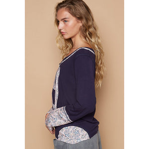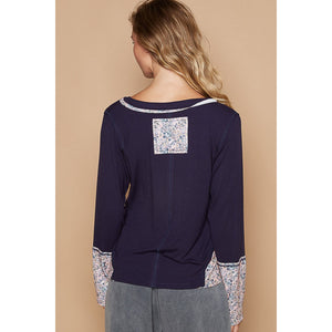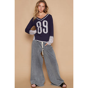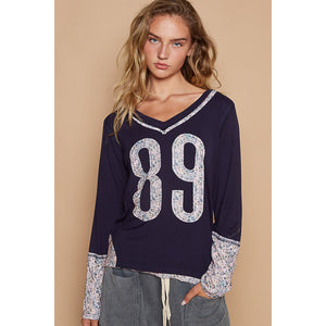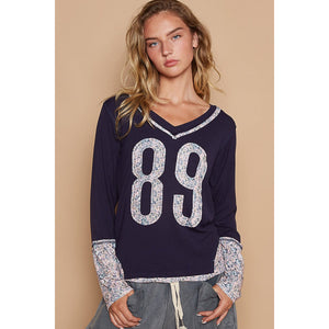 POL V-Neck Long Sleeve Floral Number Patch T-Shirt