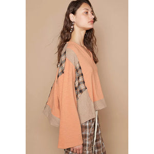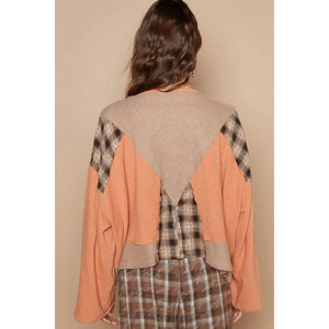 POL V-Neck Long Sleeve Plaid Contrast Top with Texture Knit Detail