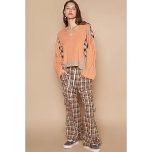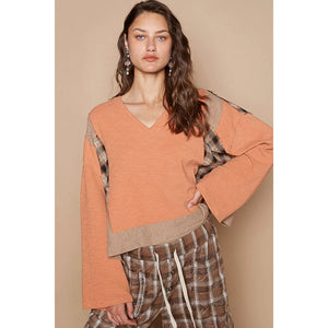 Elevate your look with our V-neck long sleeve plaid contrast top featuring texture knit detail. This top combines classic plaid patterns with modern textures for a unique and stylish ensemble. The V-neck adds a touch of elegance, while the texture knit detail adds depth and interest to the design. Perfect for both casual and dressy occasions, this top offers versatility and sophistication. Stand out in style and showcase your fashion-forward sense with this chic and trendy piece.