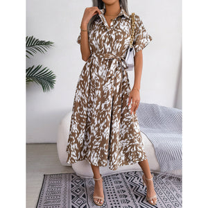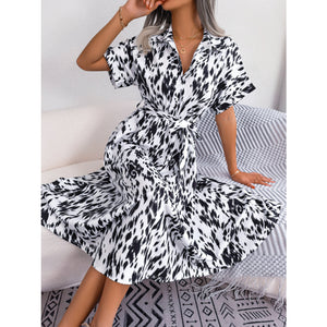 Printed Collared Neck Short Sleeve Tie Waist Dress