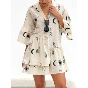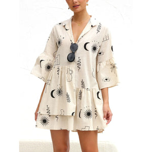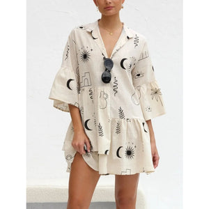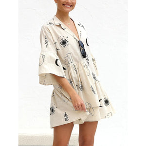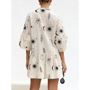 Printed Collared Neck Three-Quarter Sleeve Mini Dress