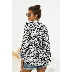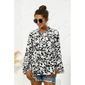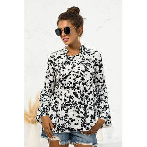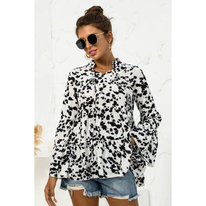 Printed Flare Sleeve Tie Neck Ruffle Trim Blouse