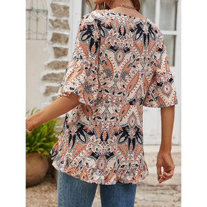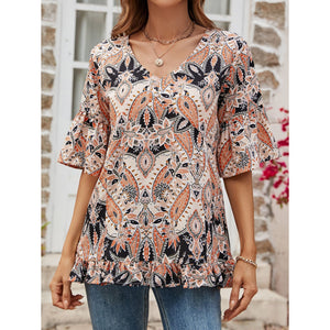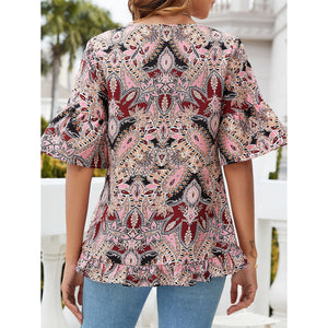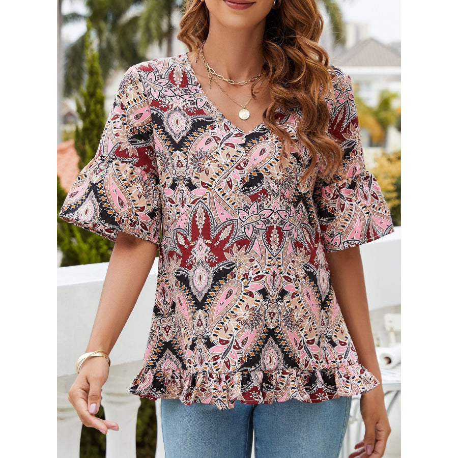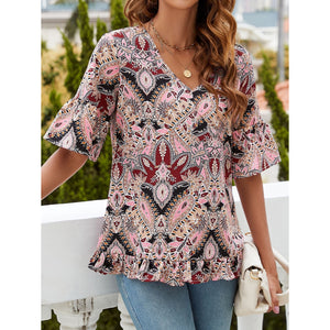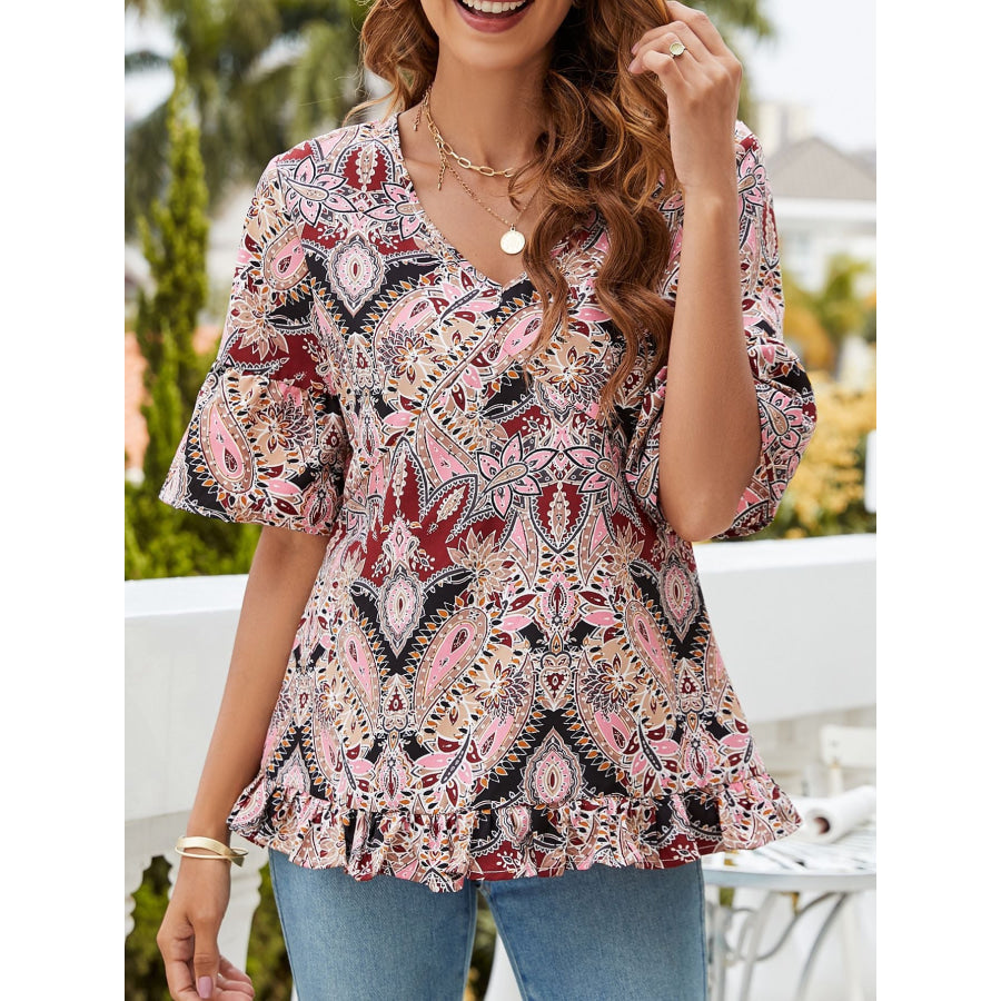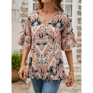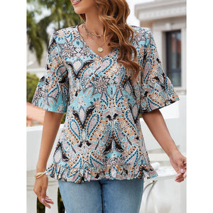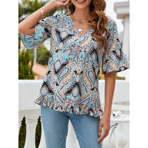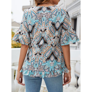Printed Flounce Sleeve Ruffle Hem Blouse