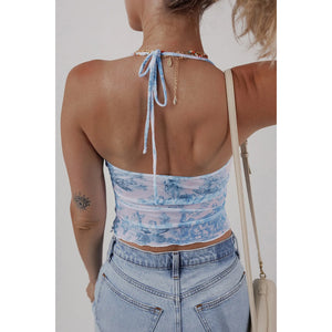 Printed Mesh Bow Detail Halter Neck Tank Top