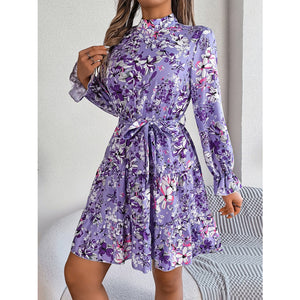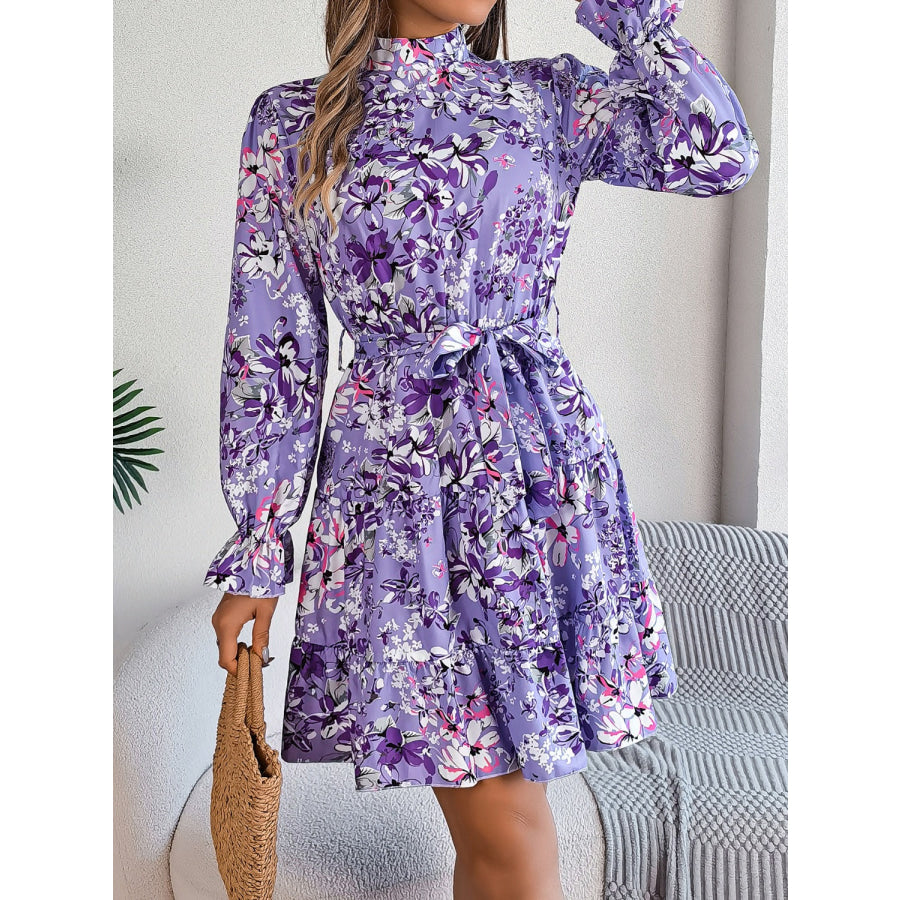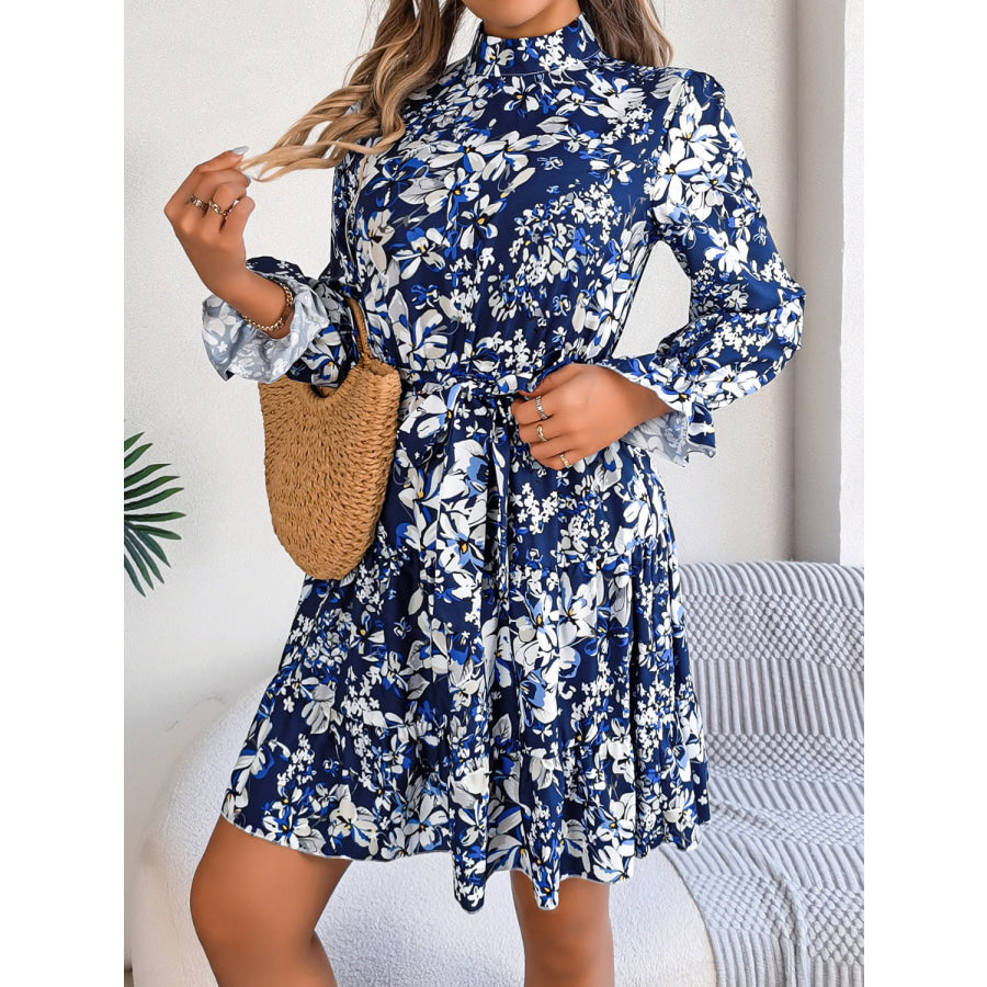 Printed Mock Neck Flounce Sleeve Mini Dress