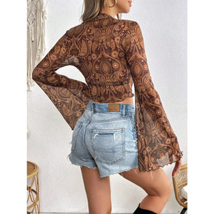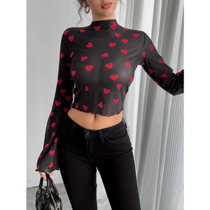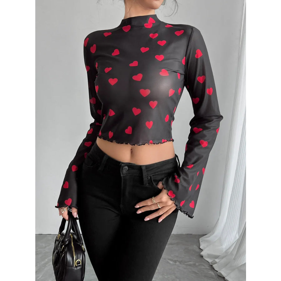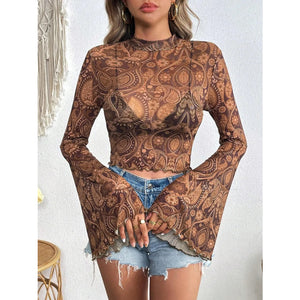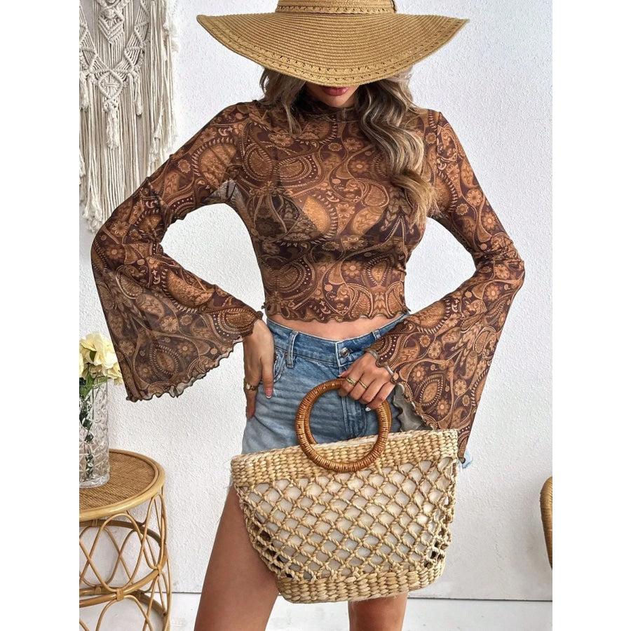 Printed Mock Neck Long Sleeve Cropped T-Shirt