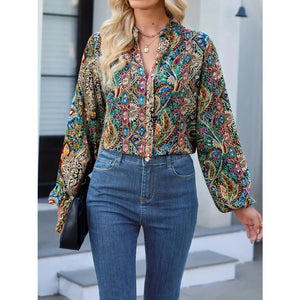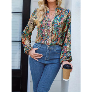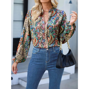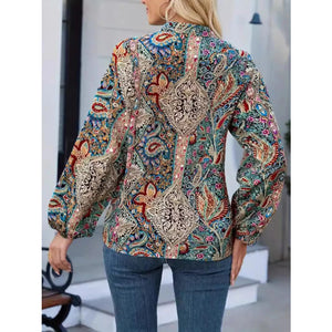 Printed Notched Balloon Sleeve Blouse