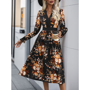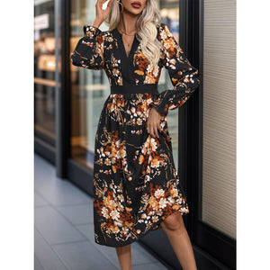 Printed Notched Long Sleeve Midi Dress