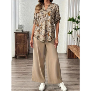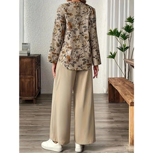 Printed Notched Long Sleeve Top and Pants Set