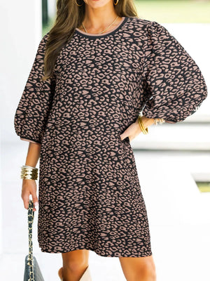 Leopard Print Bubble Sleeve Shift Mini Dress